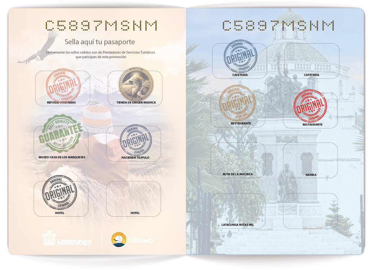 2. Requisitos para la entrega del pasaporte Entrega del pasaporte en la Dirección de Turismo El o la participante deberá tomarse tres (3) fotografías en distintos murales turísticos intervenidos por la Dirección de Turismo del GAD Municipal de Latacunga, ubicados en el casco urbano y rural del cantón. Las fotografías deben ser publicadas en redes sociales personales (Facebook o Instagram) con los hashtags oficiales: #LatacungaTurismo, #PasaporteDeAltura, #MuralismoEnLata Al entregar el pasaporte en la Dirección de Turismo, se deberá presentar evidencia de las publicaciones (captura de pantalla o enlace). Entrega del pasaporte en el Refugio José Ribas – Parque Nacional Cotopaxi El o la participante deberá llegar personalmente al Refugio José Ribas (4.864 msnm), donde el personal autorizado del Parque Nacional Cotopaxi entregará el pasaporte y colocará el sello correspondiente como constancia de la visita y del esfuerzo realizado. Entrega del pasaporte en los Establecimientos turísticos afiliados. 3. Recorrido de sitios y recolección de sellos El Pasaporte de Altura contará con espacios para al menos 12 sellos, que los participantes deberán recolectar visitando distintos puntos turísticos del cantón. Los sellos se podrán obtener en: Museos de Latacunga, donde se promueve la historia y el patrimonio local. (Casa de los Marqueses de Miraflores y Hacienda Obraje Tilipulo). Para obtener el sello, los participantes deberán realizar el recorrido completo del museo. Al finalizar, el guía asignado colocará el sello en su Pasaporte de Altura como constancia de la visita. Sitios turísticos de altura, como el Refugio José Ribas (4.864 msnm). Los participantes deberán llegar personalmente a este sitio de altura, donde el personal autorizado en el refugio colocará el sello correspondiente en el Pasaporte de Altura, como evidencia de su recorrido y esfuerzo. Prestadores de Servicios Turísticos, como hoteles, restaurantes, cafeterías y rutas turísticas del cantón Latacunga.